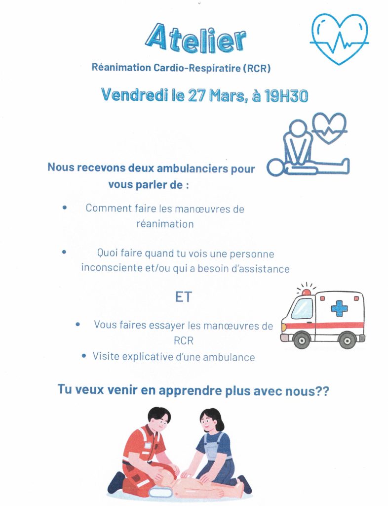 Atelier – Réanimation cardio-respiratoire (RCR) ( vendredi le 27 mars 19h30) Nous recevons deux ambulanciers pour vous parler de :