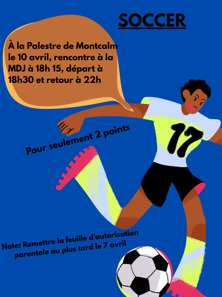 Soccer intérieur (vendredi le 10 avril) -Où : Palestre (Montcalm) -Heures : Arrivée à la MDJ vers 18h15, retour à